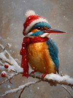 Dit kunstwerk vangt de charme van de winter op een speelse en warme manier. Een ijsvogel met felblauwe vleugels en een oranje borst zit op een besneeuwde tak, terwijl sneeuwvlokken zacht om hem heen dwarrelen. Hij draagt een rode kerstmuts met witte rand en een dikke rode sjaal, waardoor hij een feestelijke en vrolijke uitstraling krijgt. De combinatie van zijn natuurlijke kleurenpracht en de winterse accessoires maakt het beeld zowel humoristisch als hartverwarmend. De subtiele penseelstreken en zachte achtergrond geven de compositie een schilderachtige, bijna sprookjesachtige sfeer. Dit werk brengt een glimlach en roept de magie van de feestdagen op. Het is een unieke combinatie van natuur en kerstvreugde, perfect om tijdens de wintermaanden gezelligheid en kleur in huis te halen.
