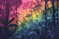 Deze prachtige illustratie brengt een betoverend regenwoud tot leven in een adembenemend kleurenpalet. De dichte vegetatie en hoge bomen worden verlicht door een kleurrijke, dromerige achtergrond, die van roze en geel naar blauw en groen verloopt. Dit ontwerp roept het gevoel op van een mystieke, serene wereld waar de natuur in volle bloei is. Ideaal voor het decoreren van moderne woon- en werkruimtes, of voor iedereen die van kleur en natuur houdt. De diepe contrasten en levendige tinten zorgen ervoor dat dit kunstwerk een echte blikvanger is in elk interieur. Voeg een vleugje tropische magie toe aan je huis met deze unieke print.