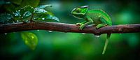 Een levendige, groene kameleon presenteert zich elegant op een tak, terwijl zachte regendruppels hem een frisse uitstraling geven. De harmonieuze groene tinten en het organische decor creëren een rustgevende sfeer, ideaal voor een slaapkamer of een creatieve ruimte waar inspiratie en ontspanning hand in hand gaan.