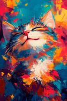 Een stralend schilderij vangt de pure vreugde van een kat die geniet van een symfonische kleurexplosie van levendig blauw, oranje en rood. Zijn gesloten ogen en zachte uitdrukking geven een gevoel van gelukzaligheid, alsof hij de geur van de lente in de lucht voelt. Een levendige viering van kleuren en emoties!