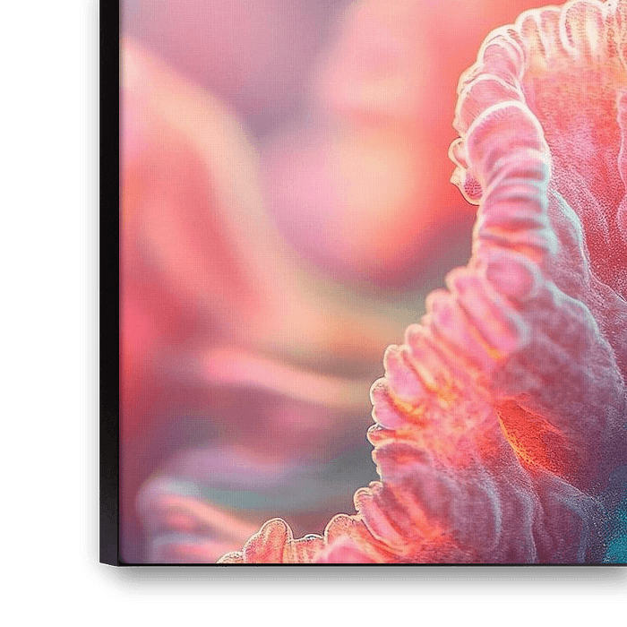 Gebogen vormen in zachte pastelkleuren doen denken aan een levendige onderwaterwereld. De delicate texturen en harmonieuze structuur creëren een gevoel van rust en fascinatie. Ideaal voor de slaapkamer om een ontspannen sfeer te creëren of in de woonkamer om gesprekken over de schoonheid van de natuur te inspireren.