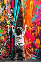 Een speels en levendig kunstwerk dat een jong kind toont dat een felgekleurd gordijn opent, onthullend een wereld vol abstracte patronen en graffiti. Het ontwerp combineert de onschuld van jeugd met de dynamiek van moderne kunst, perfect voor het toevoegen van energie en kleur aan een ruimte. Ideaal voor liefhebbers van eclectische en expressieve kunst.