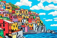 Een kleurrijk kustdorp nestelt zich tegen de steile kliffen, terwijl de zon speels haar stralen over de glanzende gevels laat dansen. De harmonieuze combinatie van levendige kleuren en de diepblauwe zee creëert een sfeer van joie de vivre en mediterrane sereniteit die de kijker onmiddellijk boeit.