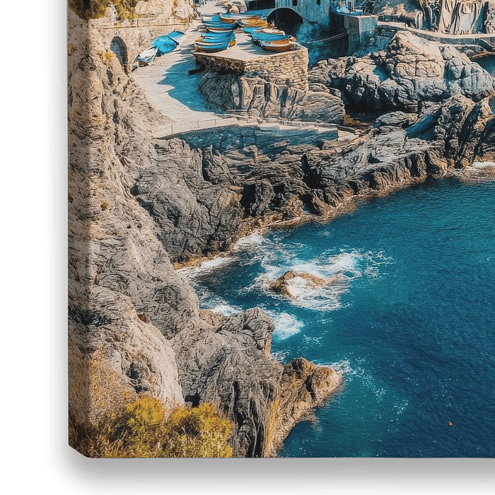 Kleurrijke huizen nestelen zich schilderachtig tegen de steile kliffen, terwijl het sprankelende blauwe water zachtjes tegen de rotsen kabbelt. Witte wolken dansen boven de horizon in de helderblauwe lucht. Dit idyllische kustplaatsje straalt mediterrane charme en tijdloze schoonheid uit, alsof het rechtstreeks uit een sprookje komt.