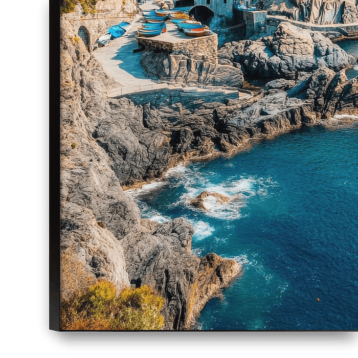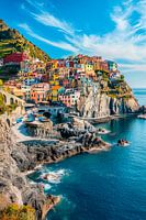 Kleurrijke huizen nestelen zich schilderachtig tegen de steile kliffen, terwijl het sprankelende blauwe water zachtjes tegen de rotsen kabbelt. Witte wolken dansen boven de horizon in de helderblauwe lucht. Dit idyllische kustplaatsje straalt mediterrane charme en tijdloze schoonheid uit, alsof het rechtstreeks uit een sprookje komt.
