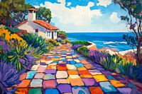 Een levendig mozaïek van kleuren trekt het oog langs een schilderachtig pad met weelderige planten en een charmant huis met een rood pannendak. De zachte roep van de oceaan en het stralende blauw van de lucht geven een gevoel van vrijheid en heiligdom - een uitnodigend paradijs waar de zorgen van alledag vervagen.