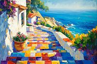 Een schilderachtig pad van kleurrijke tegels slingert zachtjes langs de kliffen, omzoomd door fleurige bloemen en charmante witgekalkte huizen. Op de achtergrond glinstert de blauwe zee onder de warme zon, terwijl de zachte golven zachtjes op de kust kabbelen. Dit tafereel straalt zorgeloze vreugde en mediterrane flair uit.