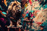 Dit ontwerp straalt creativiteit en fantasie uit. Het toont een majestueuze leeuw die zelfverzekerd op een schildersezel zit, omringd door levendige kleuren en dynamische veren. De combinatie van dieren en kunst maakt dit een uniek en intrigerend kunstwerk. Met een explosie van felle kleuren en surrealistische elementen is dit ontwerp perfect voor liefhebbers van moderne en abstracte kunst. Ideaal om een statement te maken in je interieur, bijvoorbeeld in de woonkamer of een creatieve kantoorruimte. Dit ontwerp brengt energie, inspiratie en een vleugje mysterie in elke ruimte.