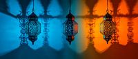 Glinsterende lichtjes dansen op de muur en creëren een harmonieus kleurenspel in blauw en oranje. De filigraanpatronen van de lantaarns vertellen verhalen uit verre landen en creëren een gezellige sfeer. Ideaal voor de woonkamer, waar het dient als blikvanger en sfeerelement voor gezellige avonden.