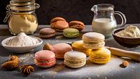 Kleurrijke macarons met bakingrediënten in het zachte licht voor een raam