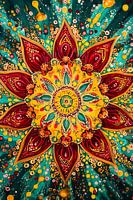 Dit kleurrijke mandala-ontwerp straalt energie en creativiteit uit. De rijke kleuren zoals geel, rood en groen worden gecombineerd met ingewikkelde patronen die een gevoel van balans en harmonie creëren. Het ontwerp is perfect voor moderne interieurs en voegt een vleugje dynamiek toe aan elke ruimte. Dit kunstwerk is een statement-piece dat zowel rustgevend als stimulerend is, ideaal voor een woonkamer, kantoor of creatieve werkplek. Het straalt positiviteit uit en kan als een prachtig middelpunt dienen, geïnspireerd door spirituele en culturele symboliek. Dit unieke ontwerp zal zeker bewondering oogsten en een blijvende indruk maken.
