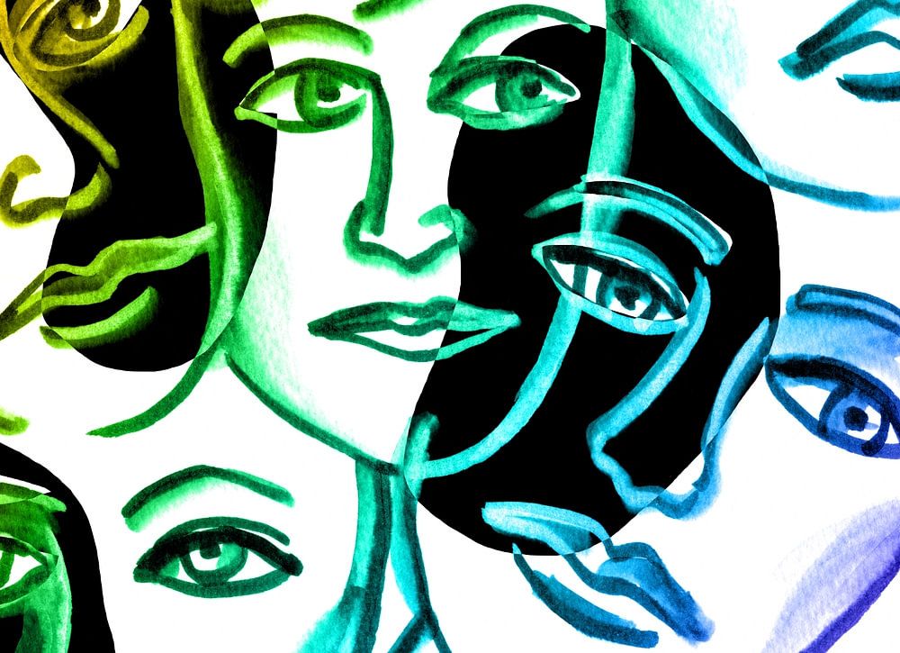 Kleurig kunstwerk van gezichten. Schilderij van verschillende gezichten in zwart, wit en alle kleuren uit de regenboog, die samen een ritmische compositie vormen.