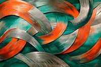 Glinsterende golven van metallic zilver en levendig oranje dansen harmonieus over een rustgevend groen oppervlak. Deze dynamische compositie voegt een modern tintje toe aan elke kamer en moedigt creativiteit en conversatie aan. Ideaal voor een stijlvolle woonkamer of een inspirerend kantoor, waar kunst en elegantie elkaar ontmoeten en je uitnodigen om te blijven hangen.