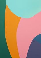 Kleurrijk modern en abstract schilderij. Moderne vormen en lijnen in roze, oranje, groen, geel en blauw. Geometrisch en organische vormen overlappen elkaar. Pastelkleuren.