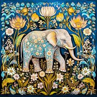 Dierenportret van de majestueuze olifant uitgevoerd in blauw, goudgeel, zwart en groen.  Het dier bevindt zich in een weelderig oerwoud vol planten en bloemen.  De dierenprint heeft een vierkant afdrukformaat.  Het schilderij geeft de olifant en de plantenwereld van het oerwoud niet realistisch weer maar in een vereenvoudigde vorm.