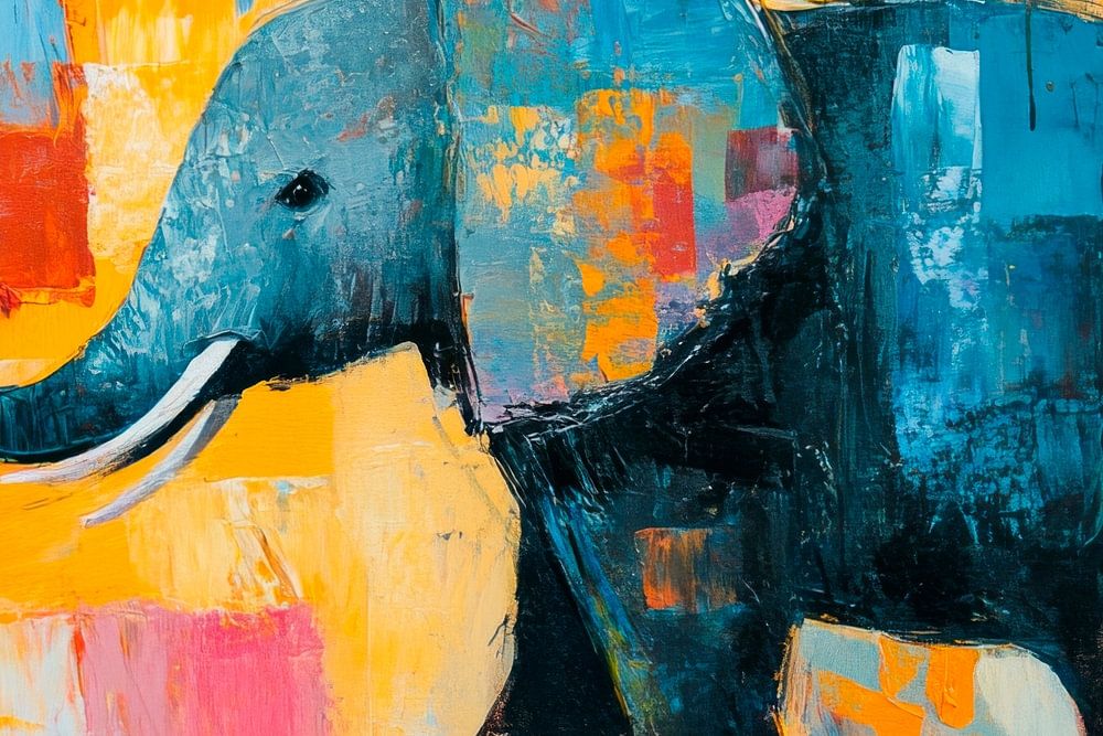Een majestueuze figuur rijst op in een harmonieuze dans tussen felle kleuren en zachte vormen. De olifant straalt rust uit tegen een levendige, abstracte achtergrond van oranje en roze. Zijn monumentale aanwezigheid wordt omlijst door een speels vleugje levendige kleur die de kijker meeneemt naar een wereld van fantasie en vreugde.