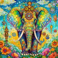 Dit is een digitaal kunstwerk van een olifant. Een abstract beeld met felle kleuren. Een vrolijk en kleurrijk schilderij geschikt voor iedere ruimte.