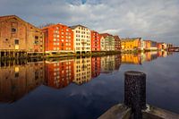 Kleurrijke pakhuizen op de Nidelva in Trondheim, Noorwegen, in de winter