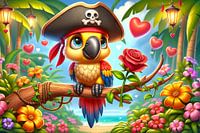 Te midden van een weelderig tropisch paradijs rust een kleurrijke papegaai op een tak, gekleed in de iconische outfit van een piraat. Met een vriendelijk ooglapje en een stijlvolle piratenhoed versierd met een klassieke schedel en gekruiste botten, belichaamt deze gevederde boekanier de essentie van een avonturier. In zijn snavel houdt hij liefdevol een perfect bloeiende rode roos, een symbool van liefde en schoonheid dat een verrassend contrast vormt met zijn ruwe uiterlijk. Zacht gloeiende lantaarns slingeren achter hem aan, hun harten fonkelen in het warme licht van de schemering. De sfeer is vervuld van magie en romantiek, benadrukt door de hartjes die als zeepbellen in de vochtige lucht zweven. Om hem heen bloeit een verscheidenheid aan tropische bloemen in levendige kleuren en het weelderige groen van de palmbladeren creëert een decor dat rechtstreeks uit een sprookje lijkt te komen. De scène is een lust voor het oog en neemt de kijker mee naar een wereld waar natuur en fantasie in perfecte harmonie bestaan.