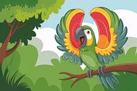 Dit speelse en levendige ontwerp toont een vrolijke papegaai die vol energie zijn vleugels spreidt. De heldere kleuren van de vogel springen uit het scherm, met vooral de warme tinten groen, geel en rood die een zonnige sfeer creëren. Op de achtergrond zien we een serene, groene omgeving met bomen en een heldere blauwe lucht, wat perfect aansluit bij het exotische karakter van de papegaai. Dit ontwerp is ideaal voor kinderkamers of andere ruimtes waar een vrolijke en positieve uitstraling gewenst is. Het trekt direct de aandacht en brengt kleur en leven in elke ruimte waar het wordt opgehangen. Een speelse touch voor elke muur!