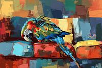 Dit levendige kunstwerk combineert de schoonheid van de natuur met abstracte kunst. Een kleurrijke papegaai, met zijn indrukwekkende verenkleed, zit ontspannen op een bank die is vormgegeven in een abstracte stijl. De contrasterende kleuren van de vogel en de bank trekken onmiddellijk de aandacht en brengen een dynamische energie in elke ruimte. Dit stuk is perfect voor liefhebbers van moderne kunst die een vleugje natuur in hun interieur willen brengen. De combinatie van levendige kleuren en abstracte vormen zorgt ervoor dat dit schilderij een opvallende toevoeging is aan elke kamer, of het nu in een woonkamer, kantoor of andere creatieve ruimte wordt geplaatst.
