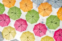 Gekleurde paraplu's hangen in de lucht boven een winkelstraat in Saumur, Frankrijk.