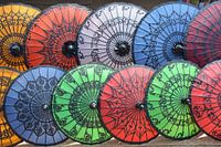 Kleurrijke ronde parasols liggen te wachten op de toeristen die het tempelcomplex van Bagan in Myanmar bezoeken en bieden bescherming tegen de hitte en zon