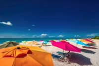 Kleurrijke parasols op een droomstrand op het eiland Aruba in het Caribisch gebied. Een fantastisch kleurcontrast zoals je dat alleen in het Caribisch gebied kunt ervaren.