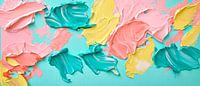 Een levendig samenspel van zachte pastelkleuren ontvouwt zich in verrukkelijke texturen en vloeiende vormen. Deze harmonieuze compositie van delicaat roze, levendig turquoise en warm geel sluimert op een rustgevende achtergrond en voegt een vrolijke noot toe aan elke kamer. De ideale keuze voor een moderne woonkamer die gezelligheid en creativiteit wil combineren.