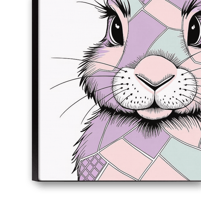 Deze unieke illustratie combineert een schattig konijnengezicht met een opvallend patchwork-design in zachte pastelkleuren zoals paars, roze en blauw. Het moderne digitale ontwerp straalt creativiteit en vrolijkheid uit, en is perfect voor mensen die van kleurrijke en speelse kunst houden. Deze print kan een geweldige toevoeging zijn aan verschillende ruimtes, zoals een slaapkamer, kantoor of zelfs een creatieve hobbykamer. Het gebruik van subtiele patronen en kleuren zorgt ervoor dat het zowel opvalt als harmonieus in een ruimte past. Perfect als geschenk of om je eigen interieur op te fleuren met iets speciaals!