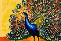 Dit kleurrijke ontwerp toont een prachtige pauw met zijn indrukwekkende verenkleed volledig gespreid. De gedetailleerde weergave van de veren in levendige tinten van groen, blauw en geel trekt direct de aandacht en maakt dit schilderij een visueel spektakel. Het kunstwerk straalt een eclectische, moderne sfeer uit en zou een prachtig…