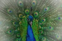 Een pronkende pauw met een mooie kleurige verenwaaier.