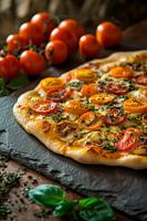 Over ‘Kleurrijke pizza met verse tomaten en basilicum’ van Poster Art Shop