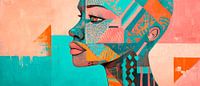 Levendige kleuren en geometrische vormen creëren een expressief silhouet dat kracht en schoonheid belichaamt. De harmonieuze combinatie van aqua en warme tinten springt onmiddellijk in het oog. Dit kunstwerk brengt een vleugje moderniteit en stijl in elke woonkamer en creëert een inspirerende sfeer.