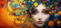 Een jonge vrouw afgebeeld in kleurrijke stippelkunst. Haar haar is een massa kleurrijke cirkels en bollen, de stemming van de afbeelding is vrolijk en blij.