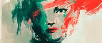 Een fascinerend portret dat de energie en diepte van menselijke emotie vastlegt met levendige kleuren en dynamische penseelstreken. De contrasterende rood- en groentinten geven het gezicht een mysterieuze uitstraling. Ideaal voor in de woonkamer, waar het elke kijker aantrekt en een stimulerend gesprek op gang brengt.