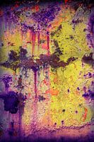 Een digitale overlay van foto's van roestige oppervlakken: Paarse, gele en rode tinten en roest vormen een chaotisch maar fascinerend mengsel. Roeststrepen, roestvlekken en gebarsten kleur creëren dynamiek op het getextureerde oppervlak.