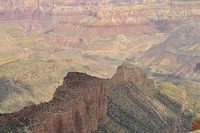 Kleurrijke rotsformatie in de Grand Canyon, North Rim. Op de bodem en de hellingen groeien bomen, die er klein uitzien. De diepte is overweldigend. De Colorado rivier heeft de kloof doen ontstaan.