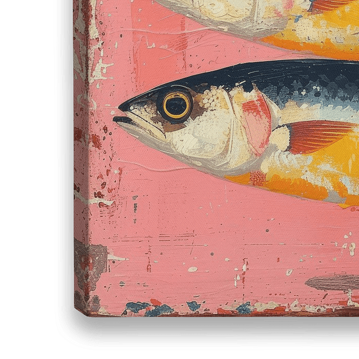 Kleurrijke sardientjes op een rij met een vintage uitstraling. Erg leuk in de keuken bijvoorbeeld. Met dit werk haal je vrolijkheid en kleur in huis! Kies zelf het formaat en materiaal bij dit werk en maak er een echte blikvanger van.