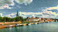 De top van de Sint Martinuskerk stijgt boven de herenhuizen en plezierbootjes uit. Maastricht is te zien vanaf de andere kant van de kant van de stad, alsof je na een gezellige lange zomeravond weer huiswaarts gaat. Geniet van een uniek uitzicht op de skyline van Maastricht in de frisse en moderne stijl van Slimme Kunst.