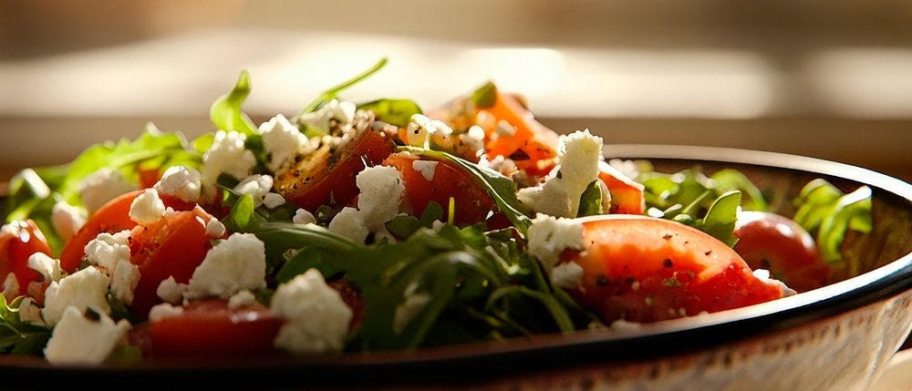 Deze kleurrijke salade is fris en smakelijk, verrijkt met felrode tomaten en pittige feta. Het spel van licht en schaduw versterkt het smakelijke uiterlijk en prikkelt de smaakpapillen. Dit kunstwerk is ideaal voor in de keuken en creëert een uitnodigende sfeer die uitnodigt om te koken en te blijven hangen.