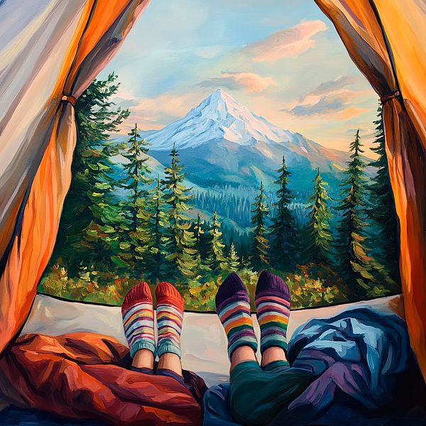 Door de open tent ontvouwt zich een droomachtig uitzicht: majestueuze bergen omringd door dichte dennenbomen en een hemelse hemel in zachte pastelkleuren. De kleurrijke sokken van de ontspannen gasten vertellen over avonturen terwijl ze zich laten meeslepen in de rust van de natuur. Een harmonieuze combinatie van gezelligheid en…
