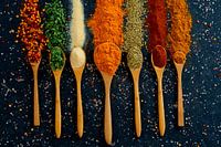 Een vrolijk palet van kruiden en specerijen op een rustieke donkere stenen ondergrond. De pollepels zijn gevuld met alles wat je nodig hebt voor het bereiden van een heerlijke maaltijd. Een mooi werk voor de keuken en achter een kookeiland.
