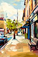 Dit levendige schilderij toont een kleurrijk straatbeeld in een stad, vol met energie en beweging. De speelse penseelstreken en het dynamische kleurgebruik geven het een moderne en abstracte uitstraling, perfect voor liefhebbers van hedendaagse kunst. De warme tinten gecombineerd met koele kleuren zorgen voor een harmonieus contrast dat elke ruimte opfleurt. Het ontwerp vangt de sfeer van een drukke stad, waarbij details zoals auto's, gebouwen en bomen duidelijk te herkennen zijn, maar op een expressieve en abstracte manier worden weergegeven. Dit kunstwerk zou een prachtige aanvulling zijn voor een woonkamer of eetkamer, waar het als een echte blikvanger zal fungeren en het interieur een moderne touch geeft.