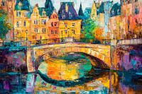 Deze indrukwekkende afbeelding vangt de schoonheid van een stadse omgeving in een explosie van kleuren en texturen. Het toont een schilderachtige brug die zich over een serene waterweg buigt, omringd door kleurrijke gebouwen die de lucht verlichten. De levendige reflecties in het water versterken het dynamische karakter van de…