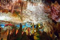 Kleurrijke stalactieten en stalagmieten in de ondergrondse grot. Palma De Mallorca, Spanje.