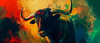 Koop dit koeien kunstwerk Kleurrijke stier in het heetst van de strijd Wilde kracht - stier in de verte van Poster Art Shop als print op canvas, aluminium dibond, (ingelijste) fotoprint, behang en ArtFrame. Voor jou op maat geprint in Fine-Art kwaliteit.
