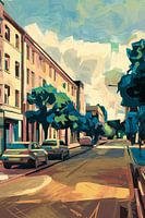 Dit kleurrijke ontwerp toont een stadsstraat met gebouwen en auto's, gevangen in een moderne, impressionistische stijl. De speelse kleuren en gelaagde penseelstreken geven het werk een levendige en dynamische uitstraling, waardoor het perfect past in een eigentijds interieur. De lucht heeft een mix van blauw en wit, wat bijdraagt aan een lichte en luchtige sfeer. Dit kunstwerk brengt niet alleen de schoonheid van het stedelijk landschap naar voren, maar voegt ook een artistieke touch toe die een ruimte kan verlichten en een unieke sfeer kan creëren. Ideaal voor liefhebbers van moderne kunst en stedelijke scènes.