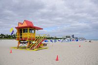 Na een overnachting in Miami Beach gingen we naar het strand voor een vroege ochtendwandeling. We vonden deze kleurrijke strandwachttoren mooi en ontdekten dat ze allemaal anders zijn.