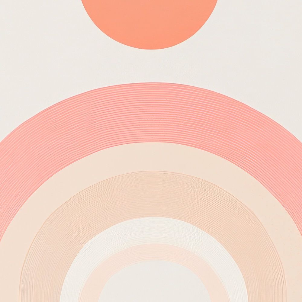 Zachte rondingen in zachte tinten roze en beige stralen rust uit, terwijl een grote, ronde cirkel van zonlicht erboven zweeft. Deze harmonieuze compositie straalt een gevoel van geborgenheid en inspiratie uit. De trapsgewijze bogen doen denken aan de magie van een zonsondergang, die tegelijkertijd een gevoel van melancholie en hoop oproept dankzij het delicate kleurenpalet.